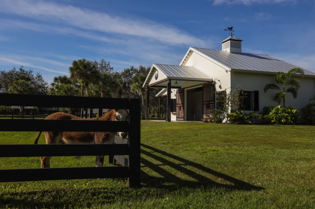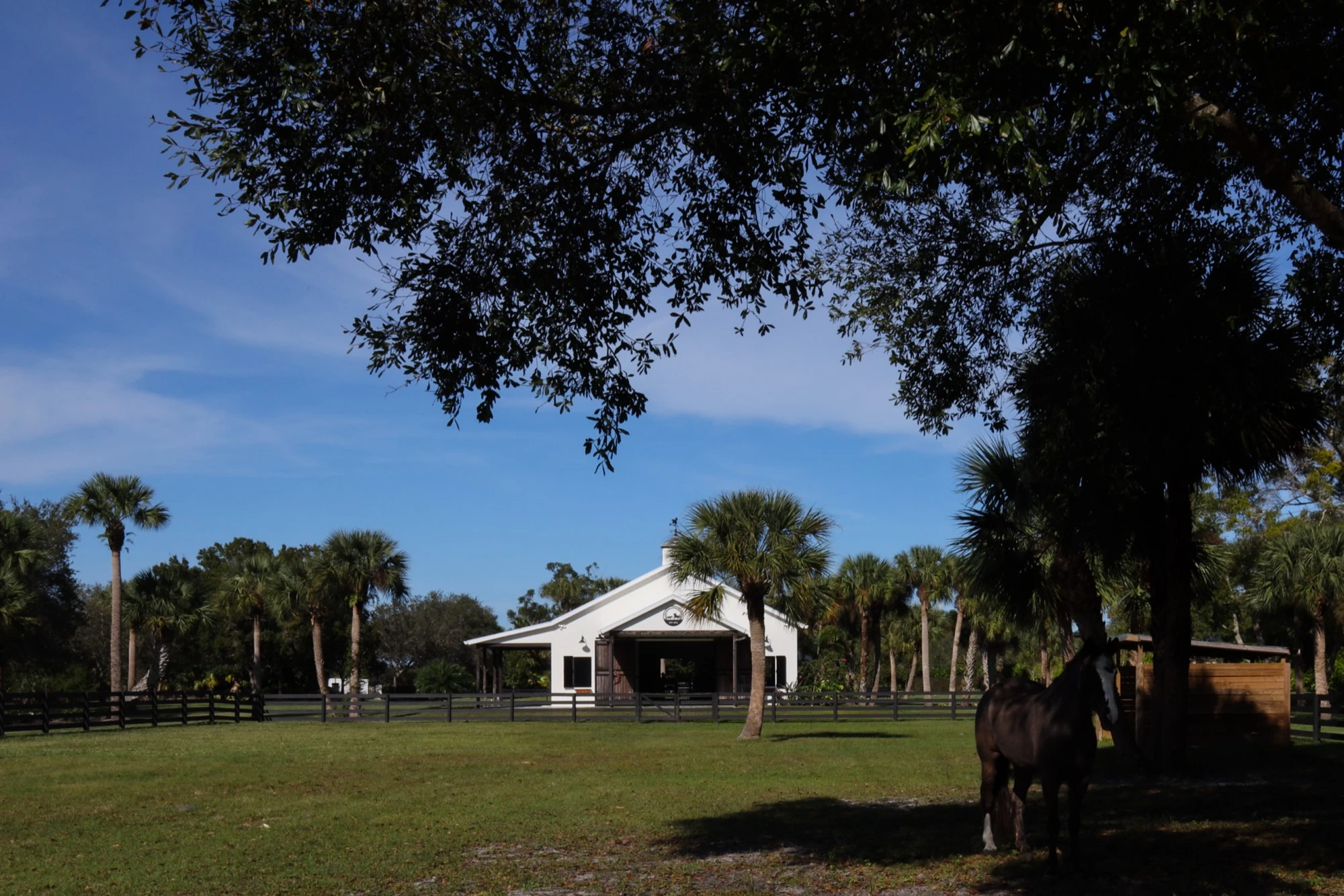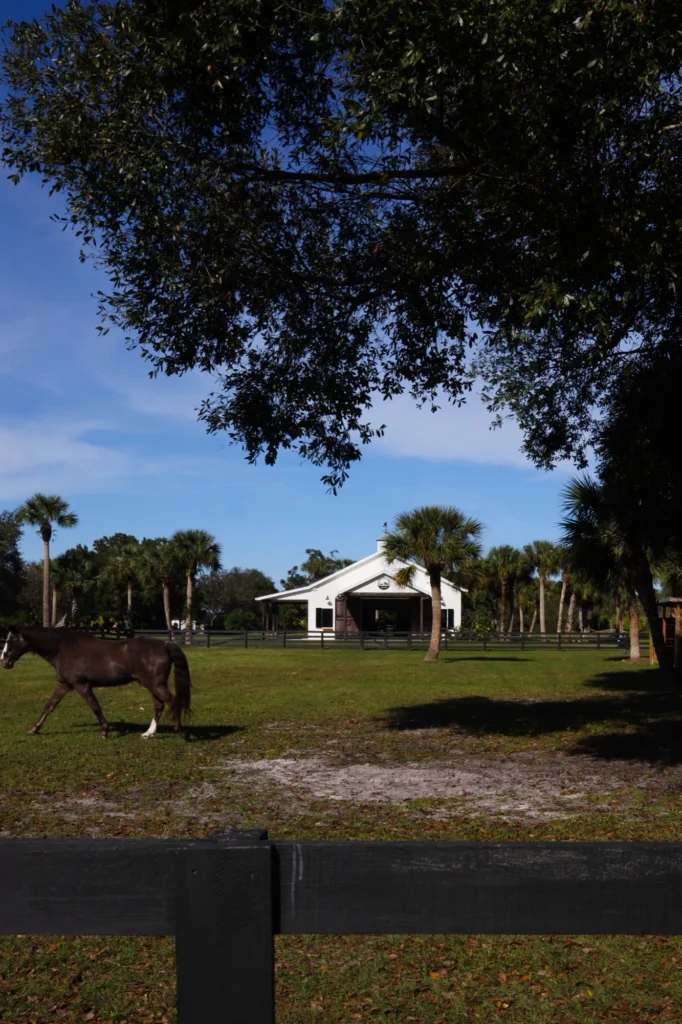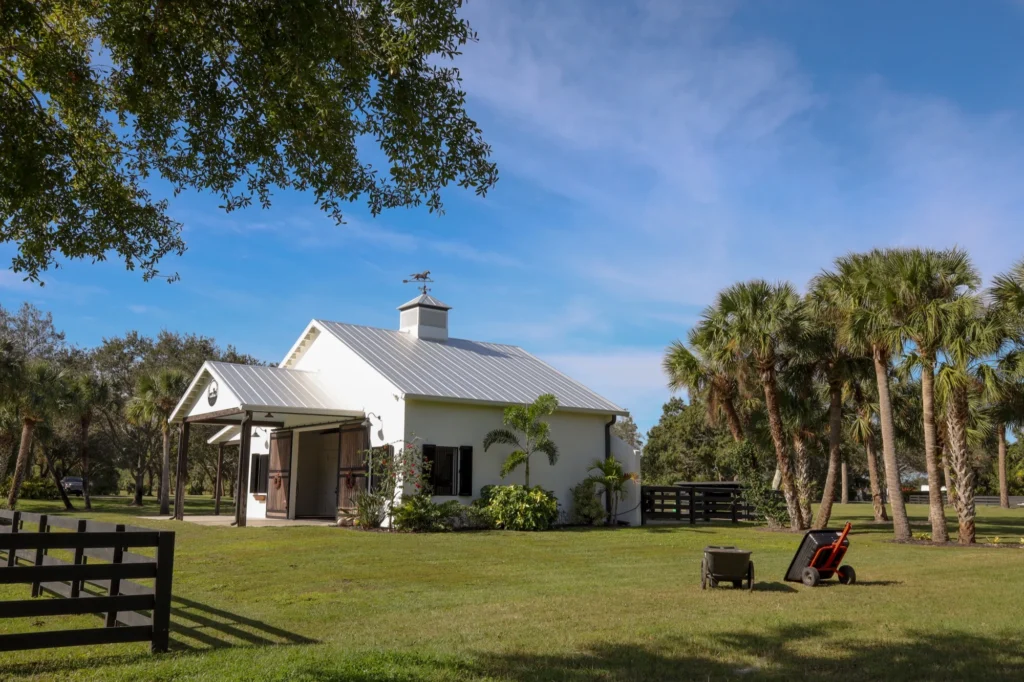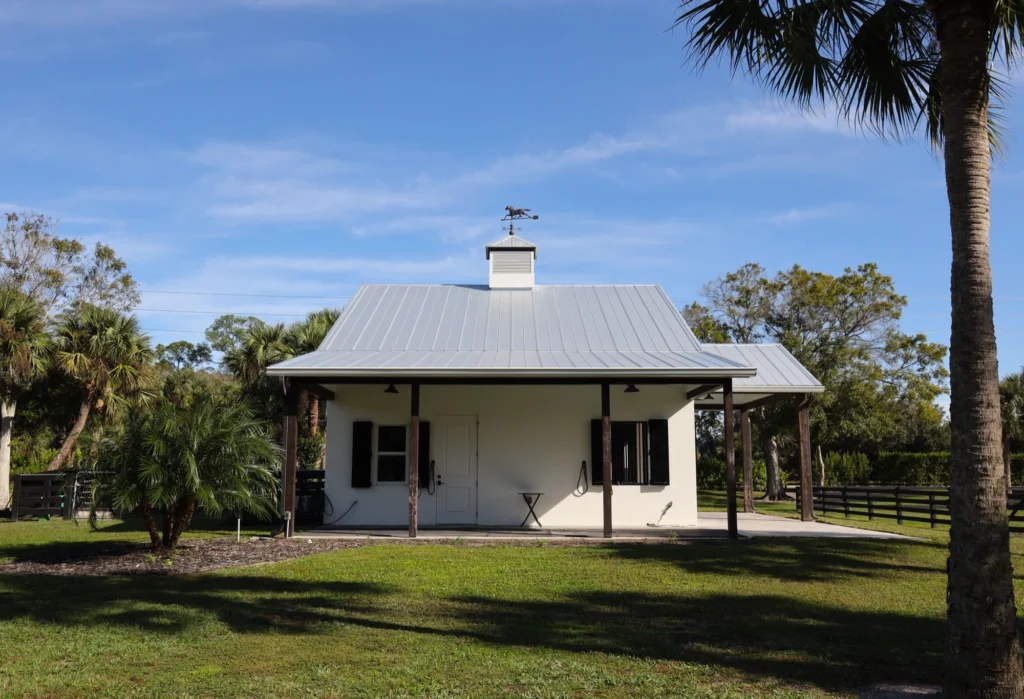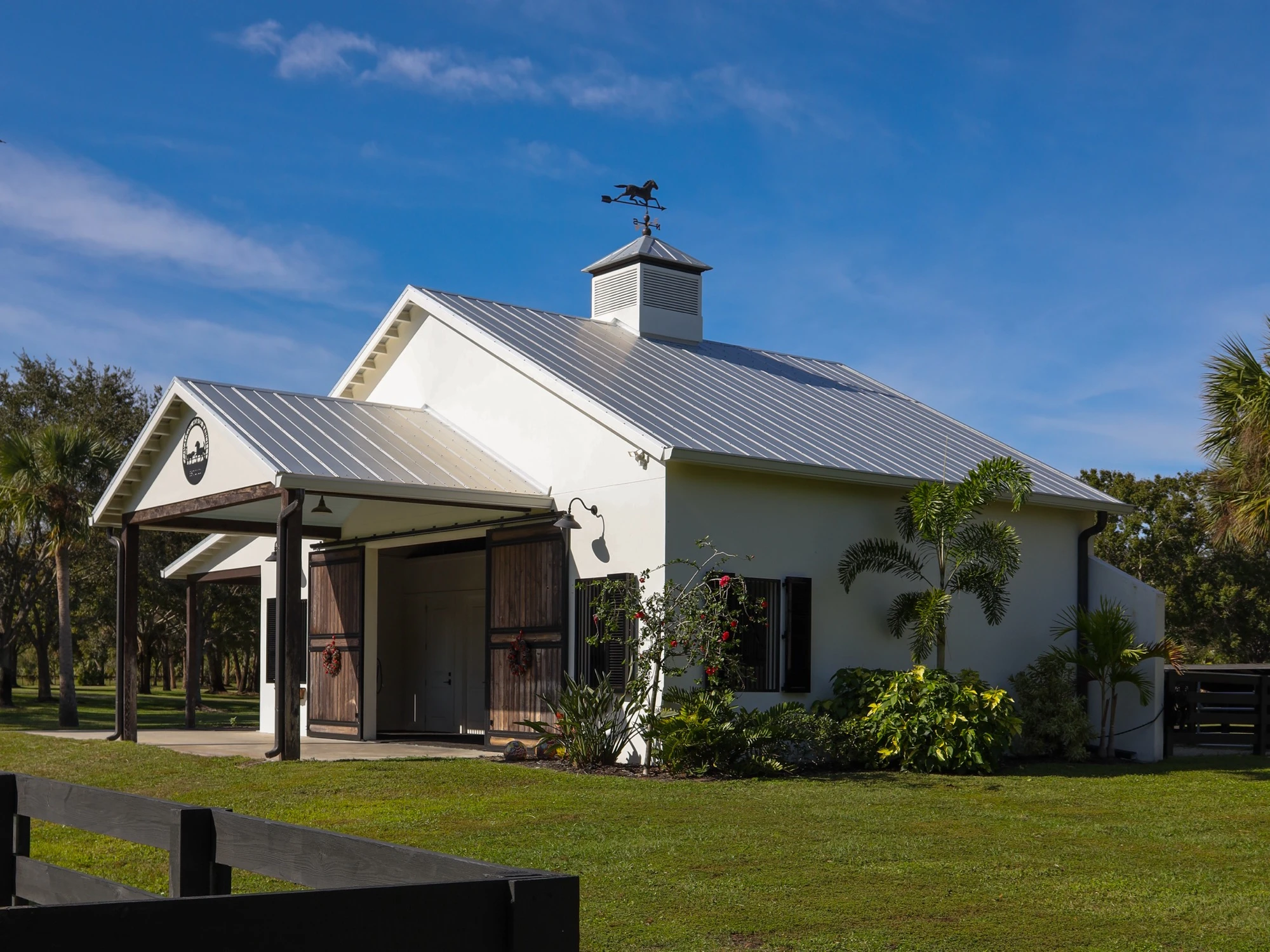 The design for a horse barn in Vero Beach’s West Corridor attempts to marry Southern charm, coastal comfort, and rural Florida farm life. Overlooking the fields on one of Vero’s remaining old citrus groves, the horse barn displays a concise use of smooth white stucco, stained wood, and metal roofing.