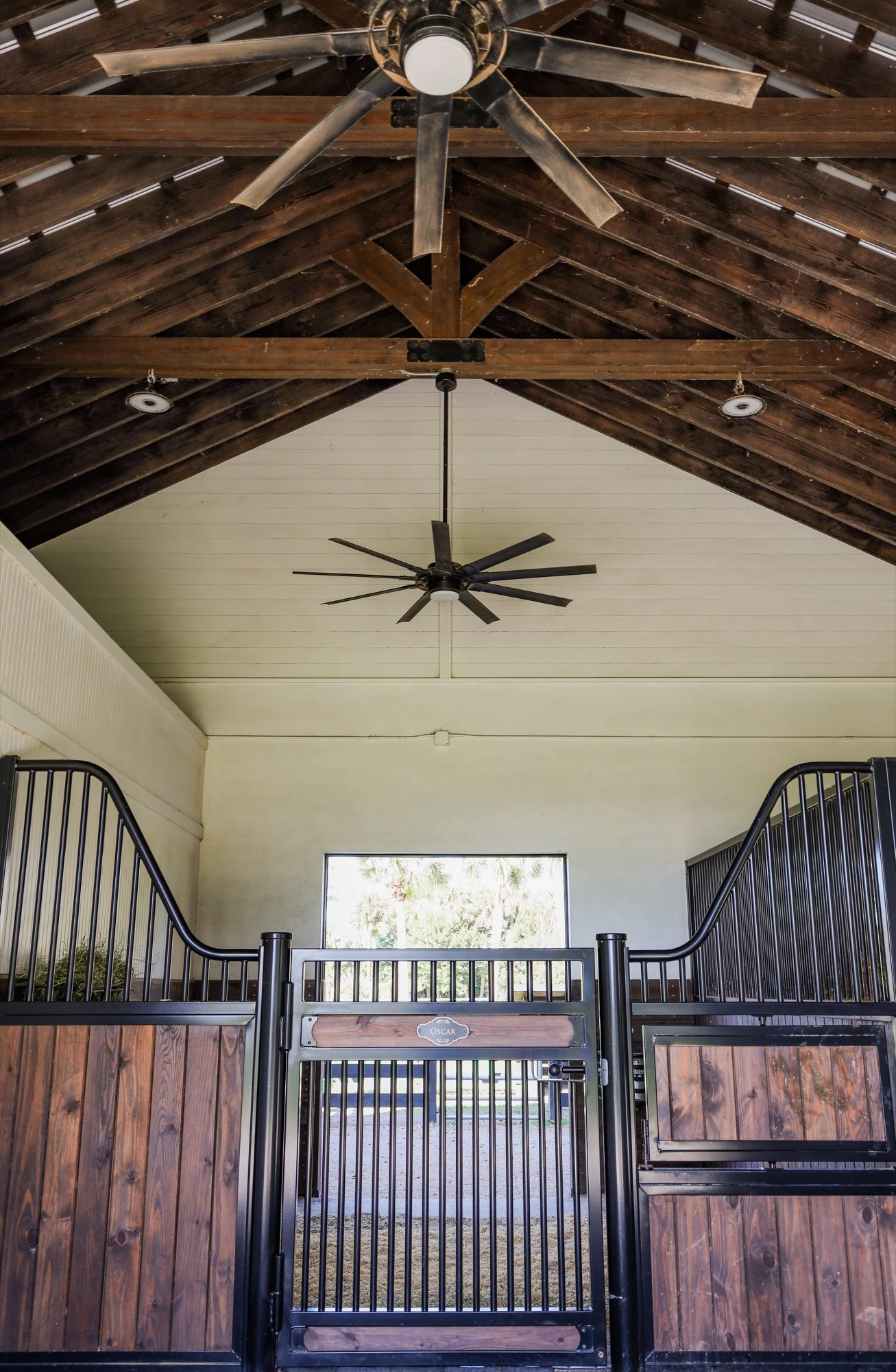 The barn’s interior features its exposed roofing system in detailed wood. Shaded openings carry the cool breeze through. The lower part of the concrete block walls are furred with wood, so that the horses don’t damage their hooves if kicked. The floor is a rubberized paver that provides comfort to the horse while also being durable and cleanable.