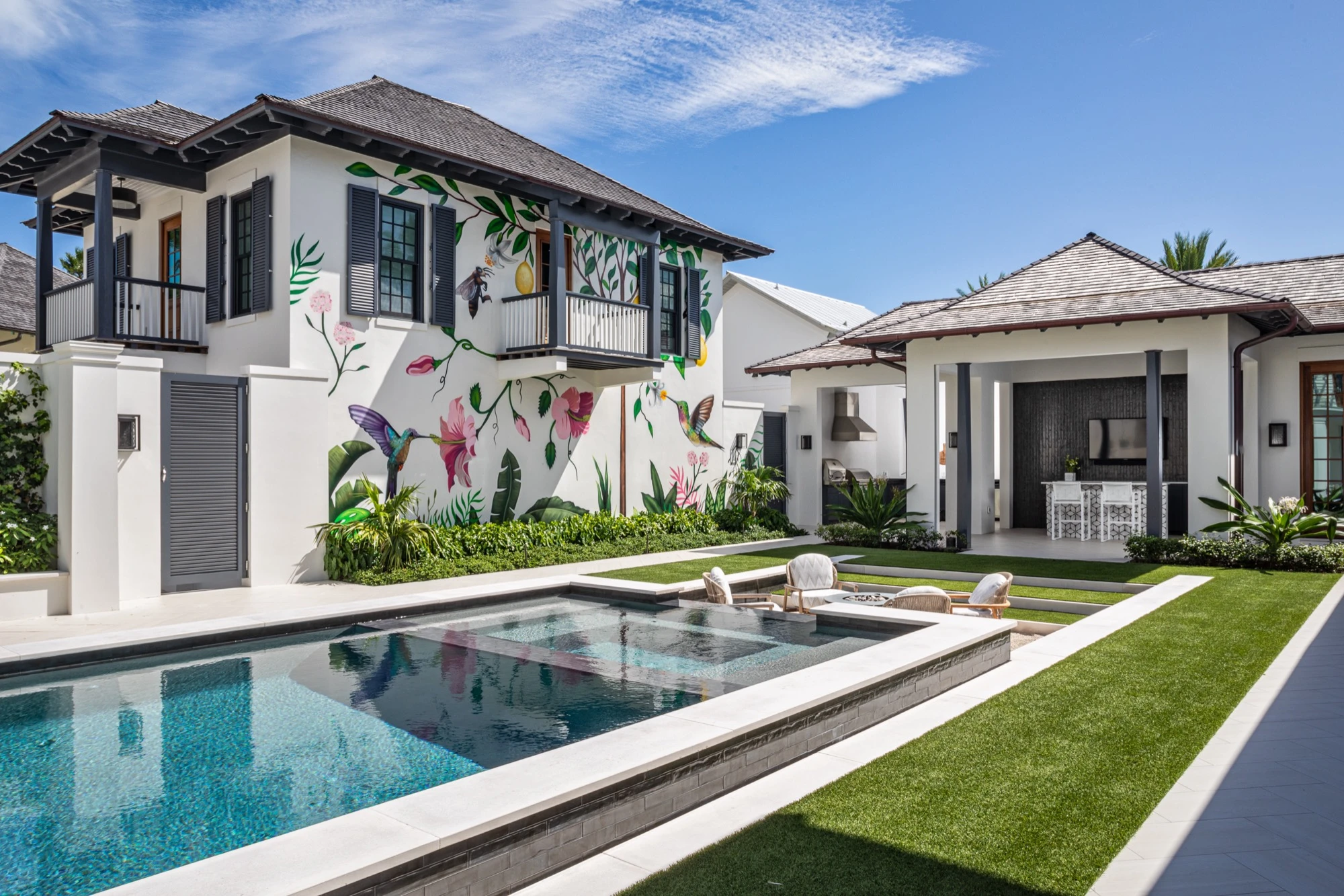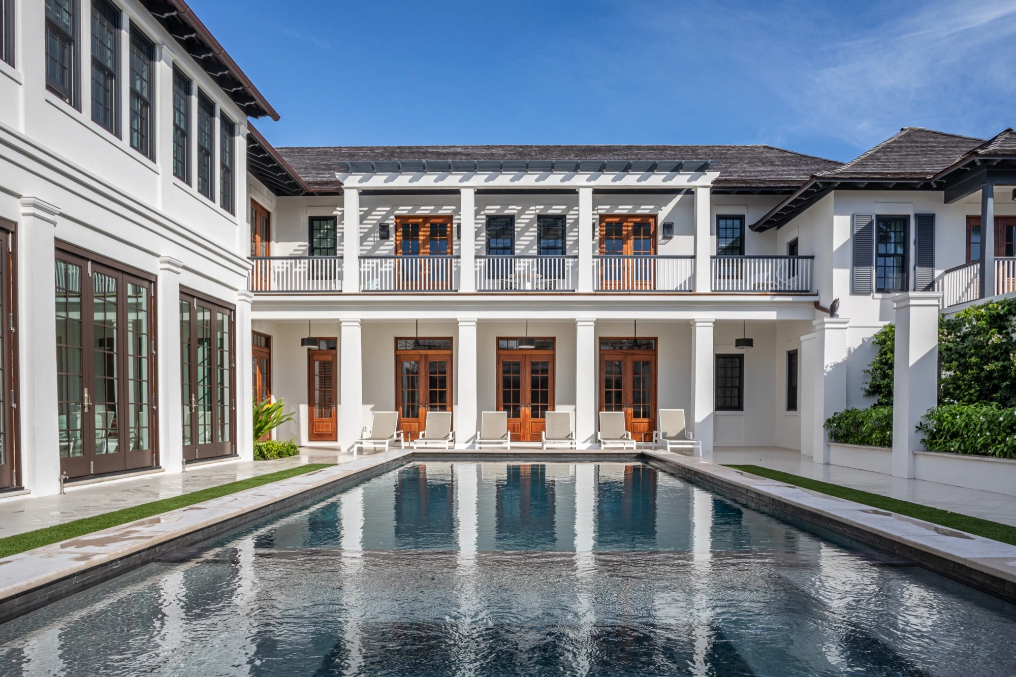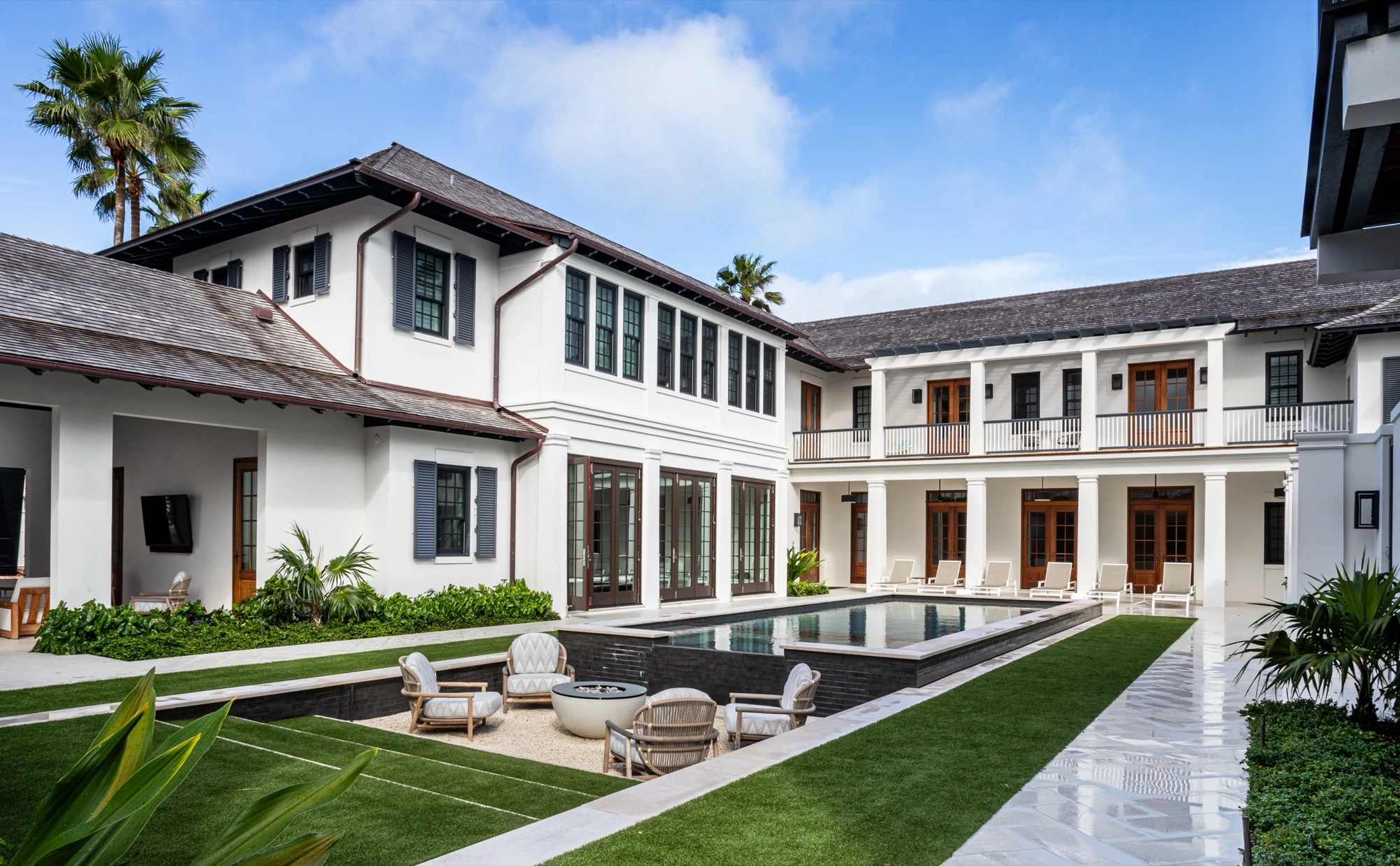 To begin, we doubled the street façade, which made the existing side porch the main axis of the new spaces. Existing porch columns were repeated around three sides of the new courtyard, becoming covered balconies, enclosed porches, and landscaping elements. The pool is anchored by a cabana that balances the space; the detached, 2-story carriage house with garage below and guest house above looks upon the dynamic landscape, as the pool lifts above the yard and the firepit carves into the ground.