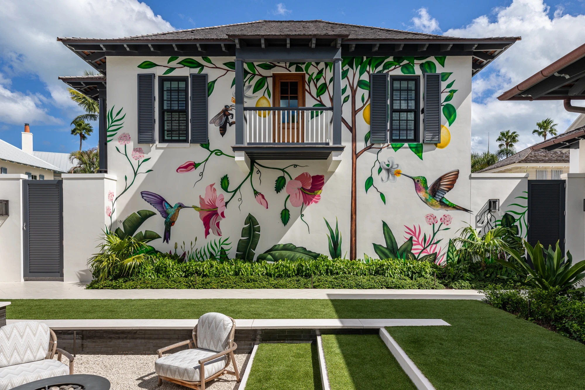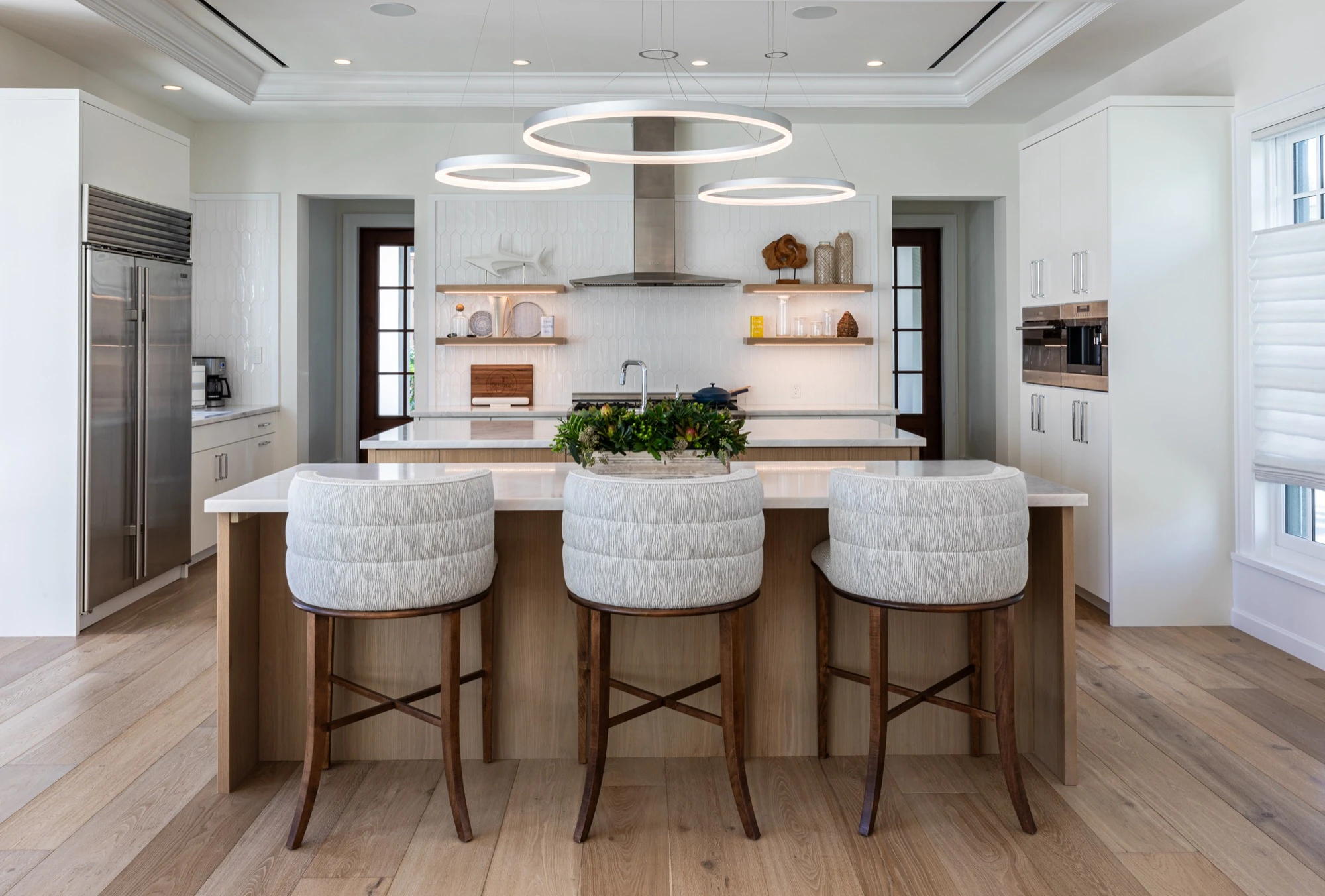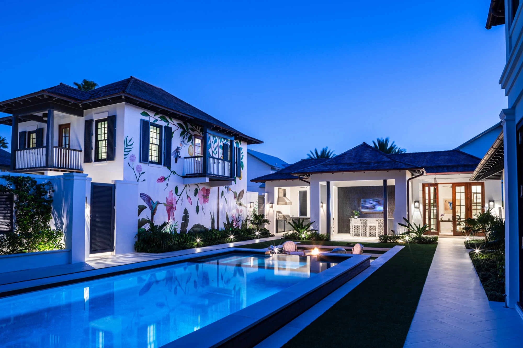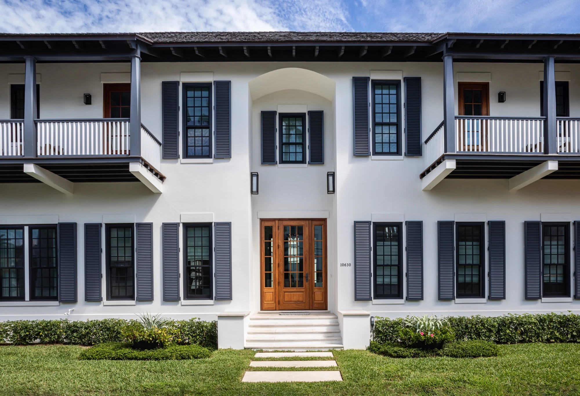 To begin, we doubled the street façade, which made the existing side porch the main axis of the new spaces. Existing porch columns were repeated around three sides of the new courtyard, becoming covered balconies, enclosed porches, and landscaping elements. The pool is anchored by a cabana that balances the space; the detached, 2-story carriage house with garage below and guest house above looks upon the dynamic landscape, as the pool lifts above the yard and the firepit carves into the ground.