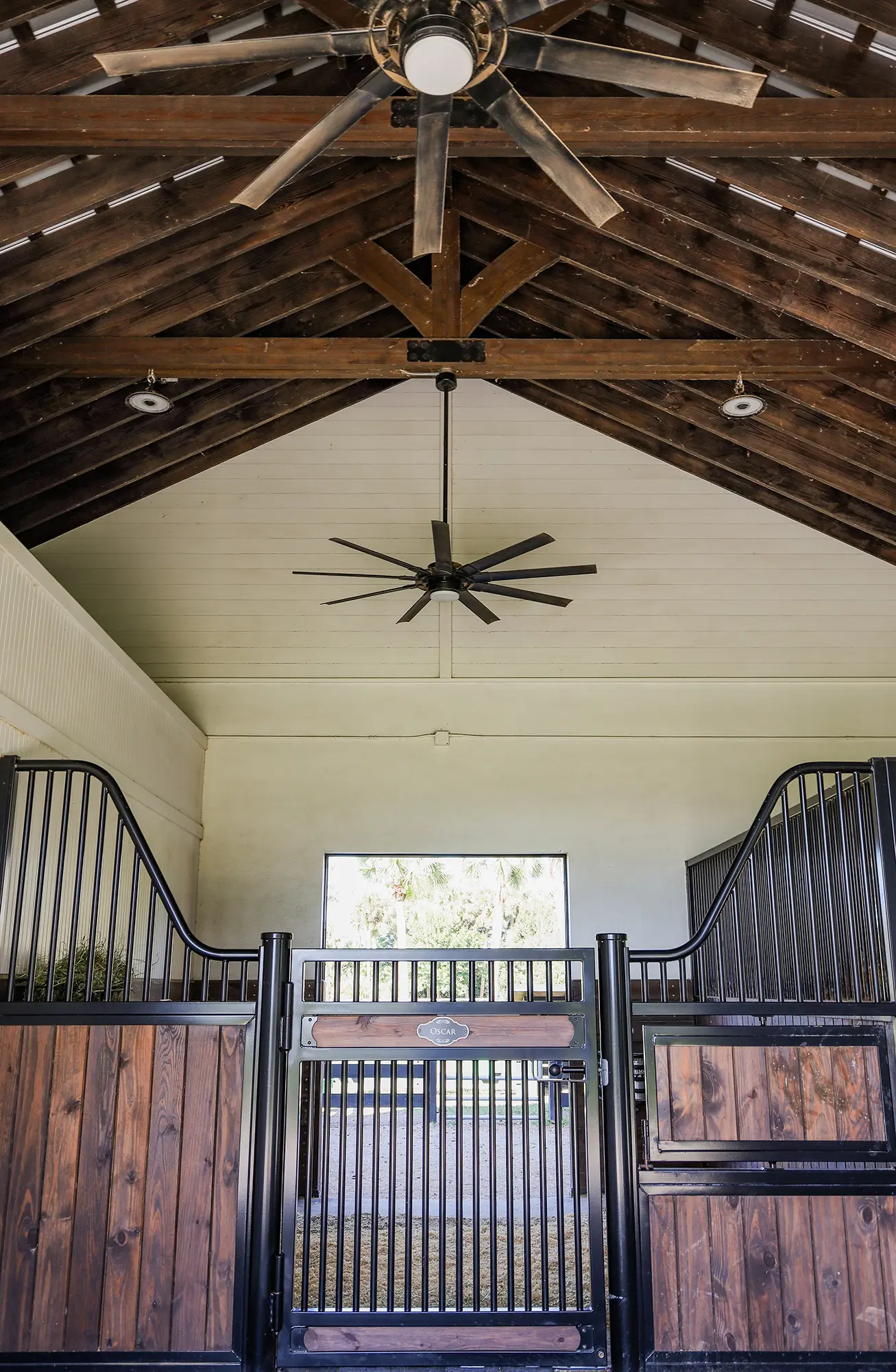 The barn’s interior features its exposed roofing system in detailed wood. Shaded openings carry the cool breeze through. The lower part of the concrete block walls are furred with wood, so that the horses don’t damage their hooves if kicked. The floor is a rubberized paver that provides comfort to the horses while also being durable and cleanable.
