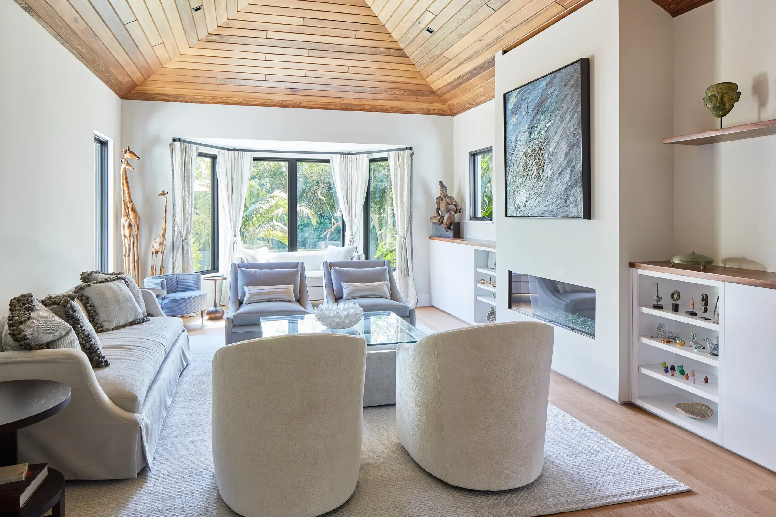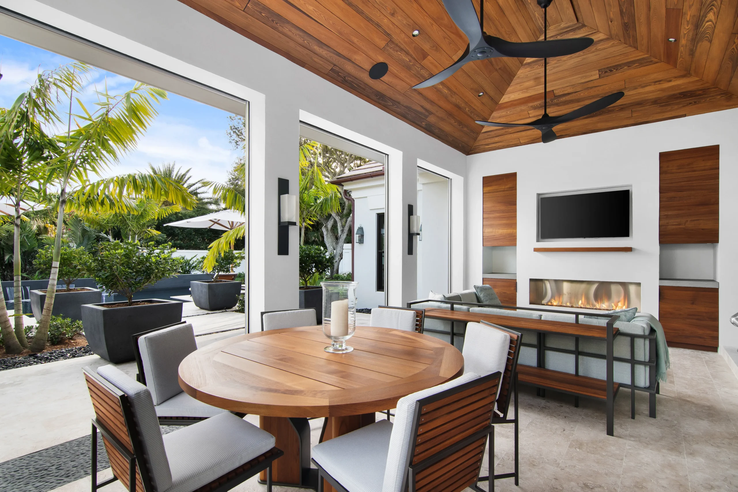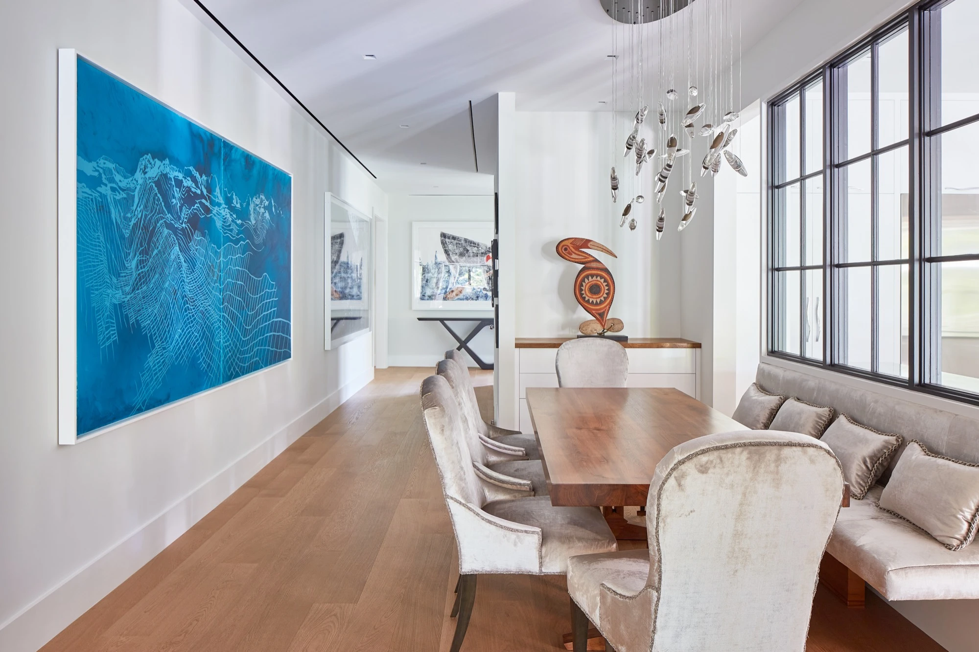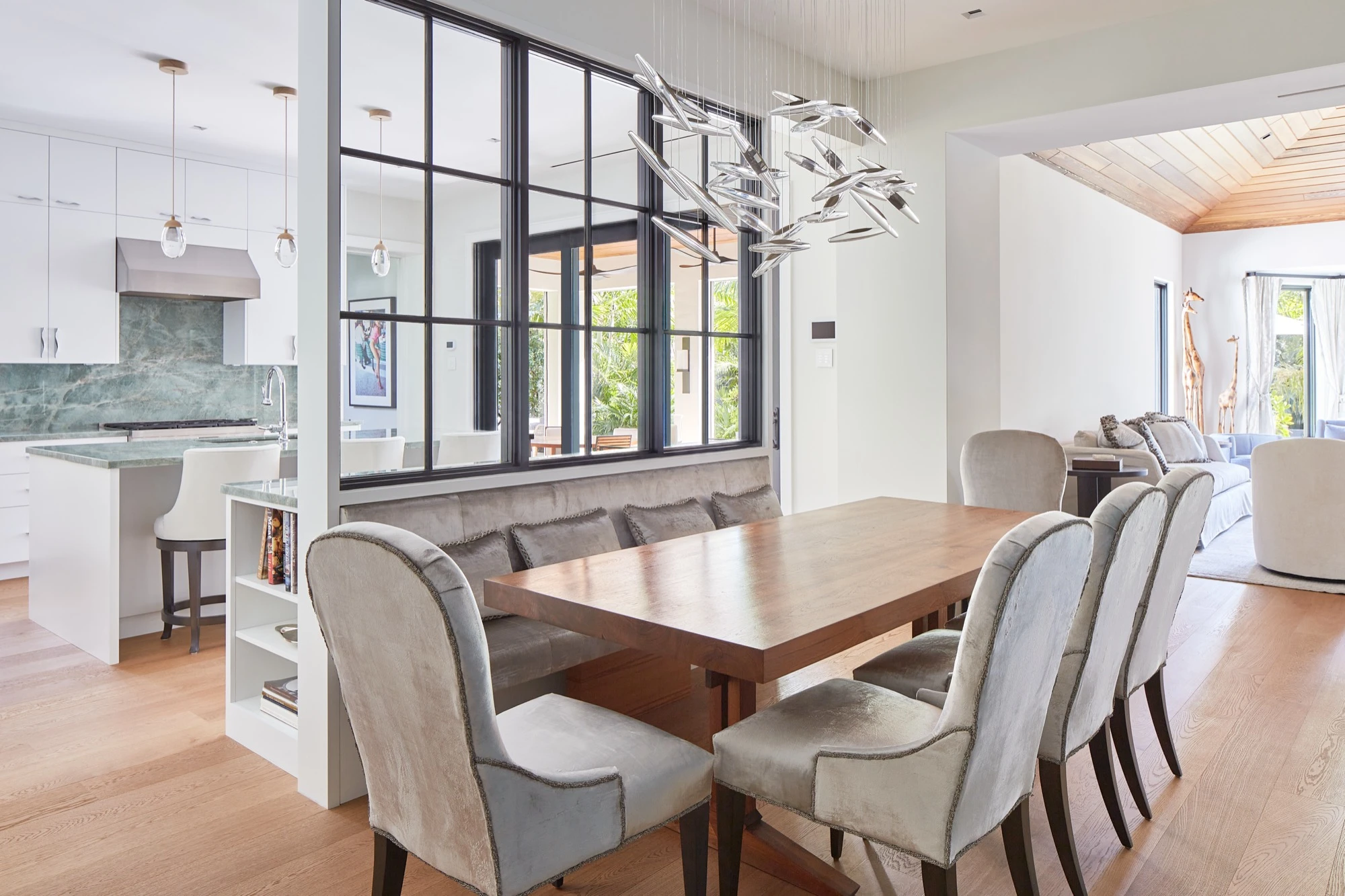 Enclosing the front covered spaces brought the front door toward the street, simplifying the entry sequence and creating a sleek gallery lined with windows on one side and art on the other. In the rear, the previously enclosed Family Room was converted to a covered outdoor space. The interior wall separating the kitchen and dining room became an interior window, further allowing the views and sunlight to stream past the home’s exterior walls.