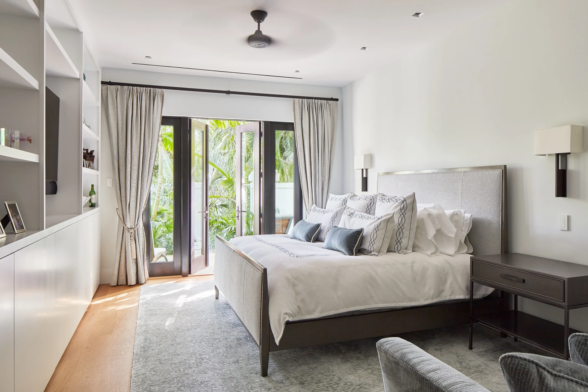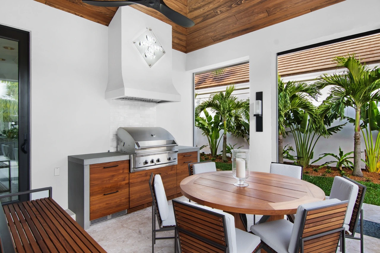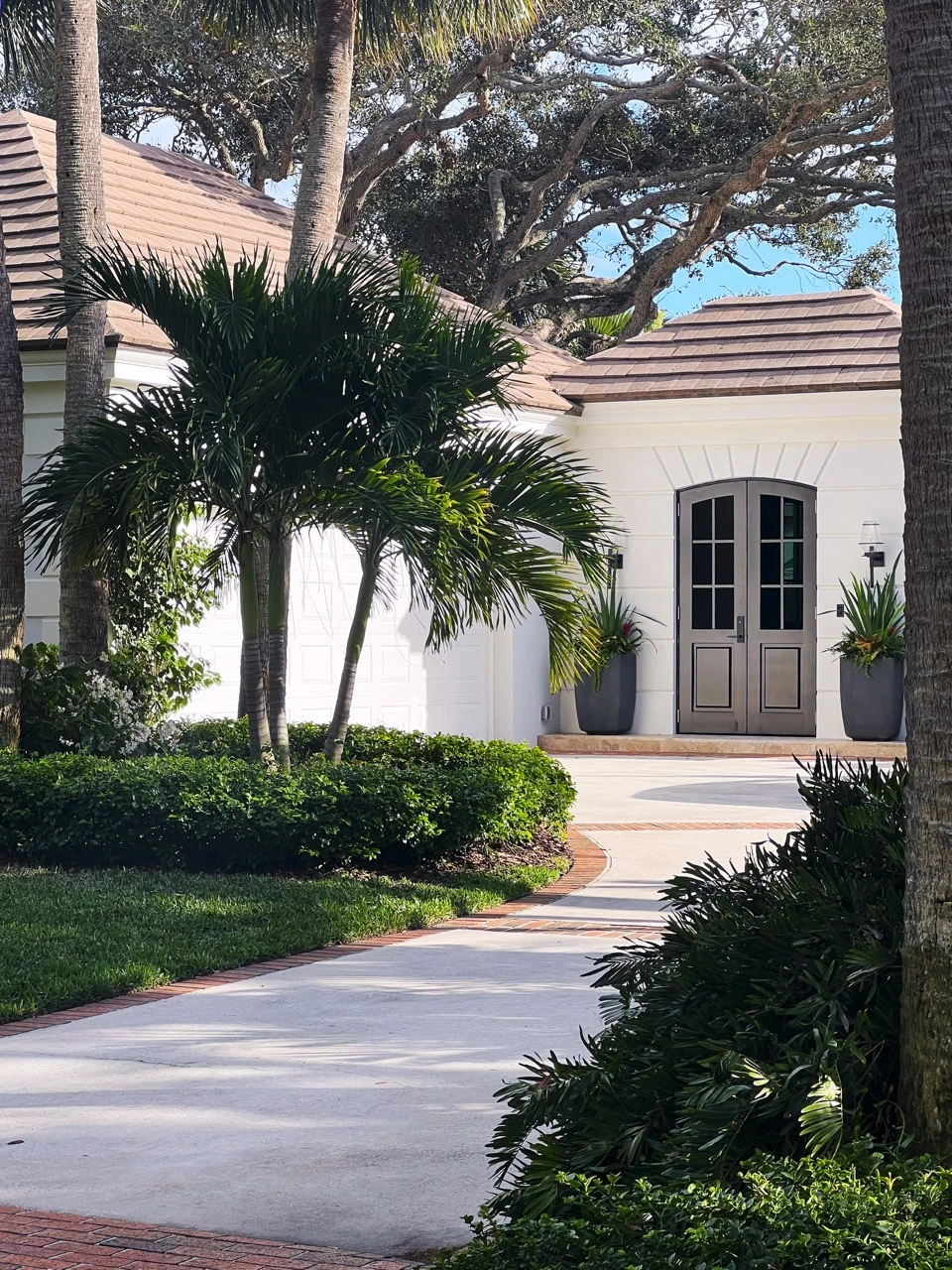 In addition to a new, contemporary landscape and pool design, the front entry was cleaned up by replacing corner quoins with rustication. The arched colonnade, exterior keystone lintels and eave trims were simplified around the perimeter of the home.