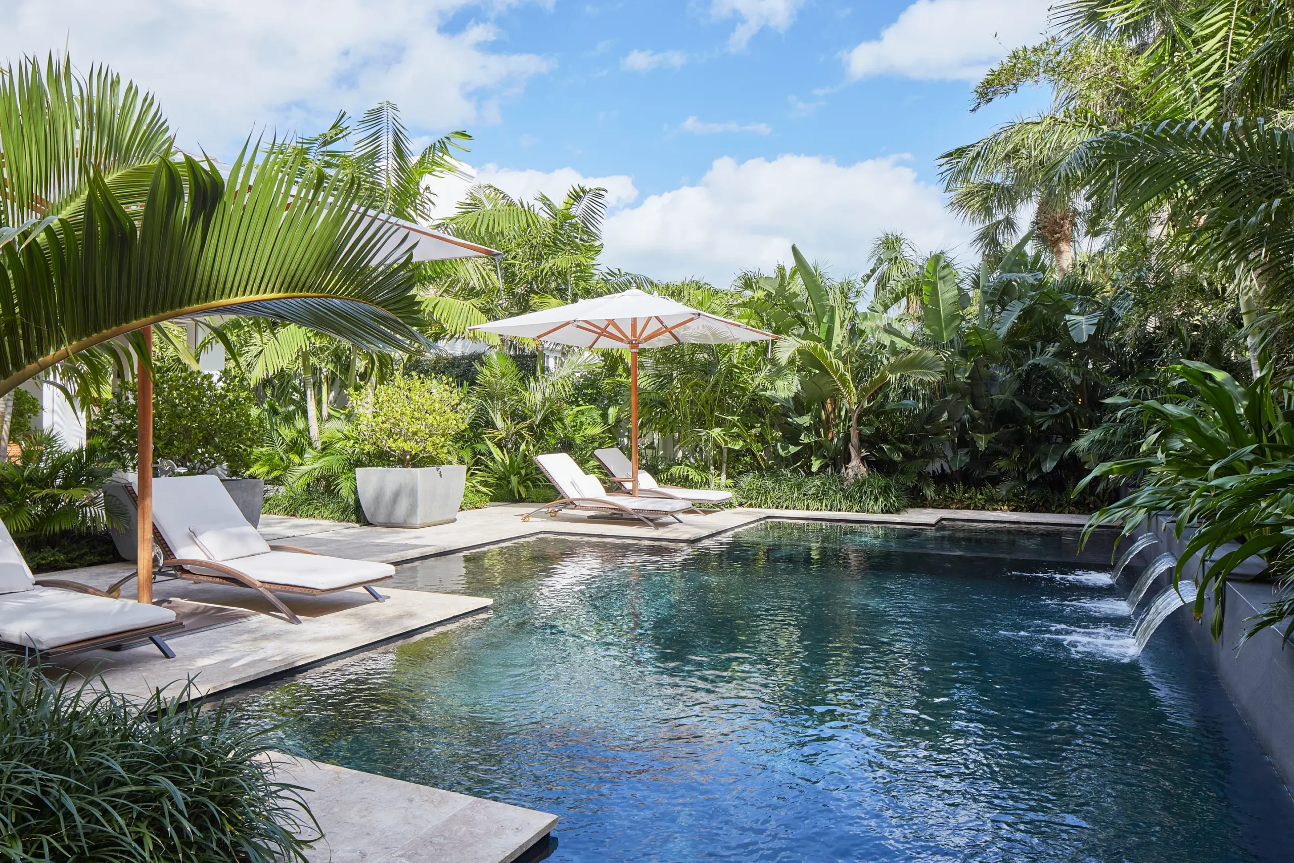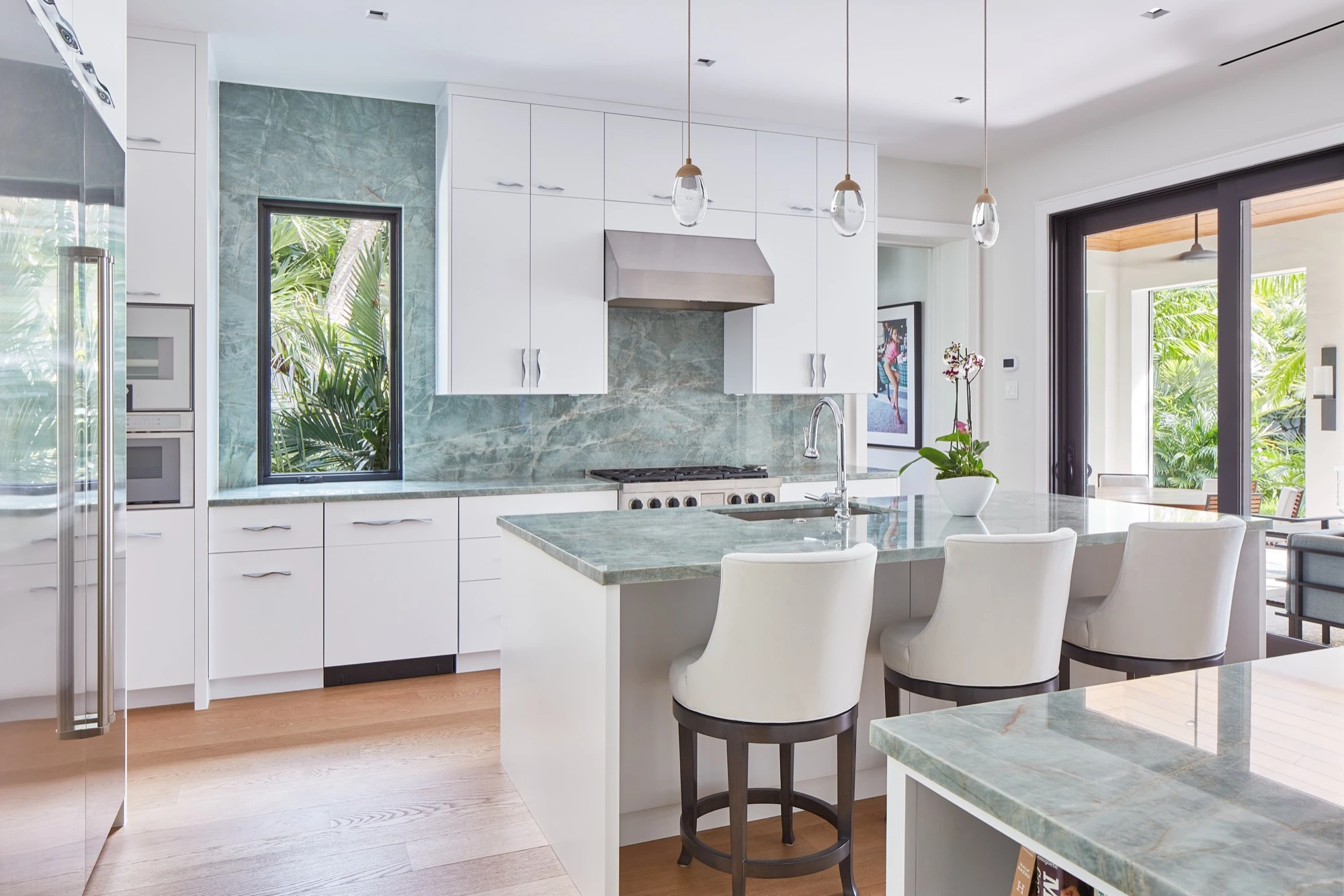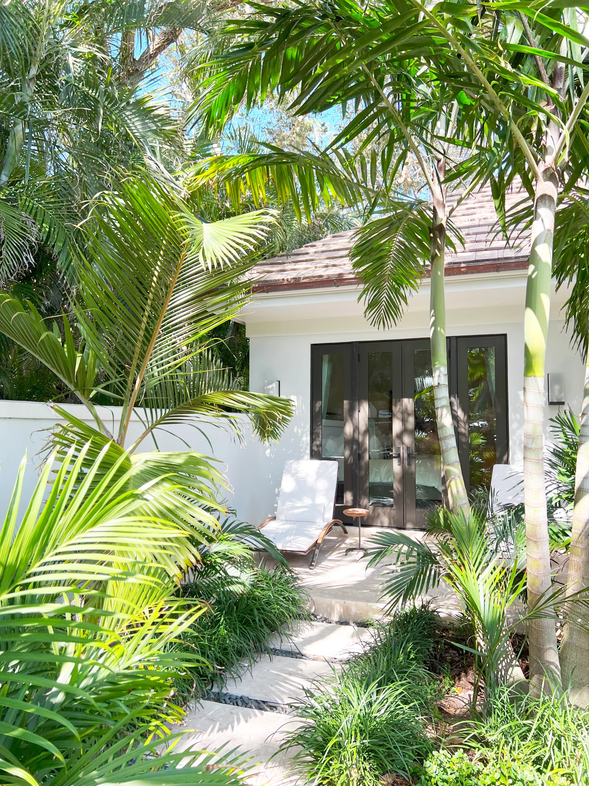 In addition to a new, contemporary landscape and pool design, the front entry was cleaned up by replacing corner quoins with rustication. The arched colonnade, exterior keystone lintels and eave trims were simplified around the perimeter of the home.